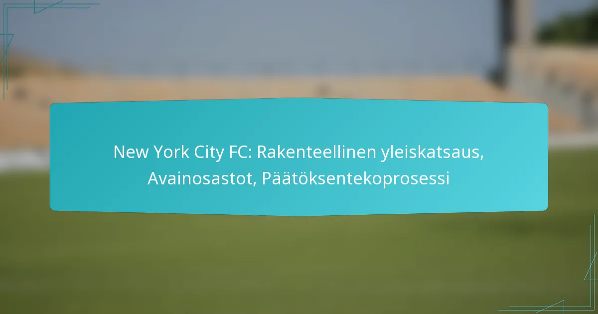 New York City FC (NYCFC) toimii ainutlaatuisessa rakenteellisessa kehyksessä, joka yhdistää omistuksen, hallinnan ja toimintastrategiat menestyäkseen Major League Soccerissa (MLS). Seuran organisaatio korostaa yhteistyötä keskeisten osastojen, kuten markkinoinnin, pelaajakehityksen ja valmennuksen, kesken, jotka kaikki vaikuttavat sen menestykseen ja yhteisön sitoutumiseen. NYCFC:n päätöksenteko seuraa strukturoitua hierarkiaa, joka edistää strategisten tavoitteiden mukaista linjausta eri sidosryhmien yhteistyöpanoksen kautta.